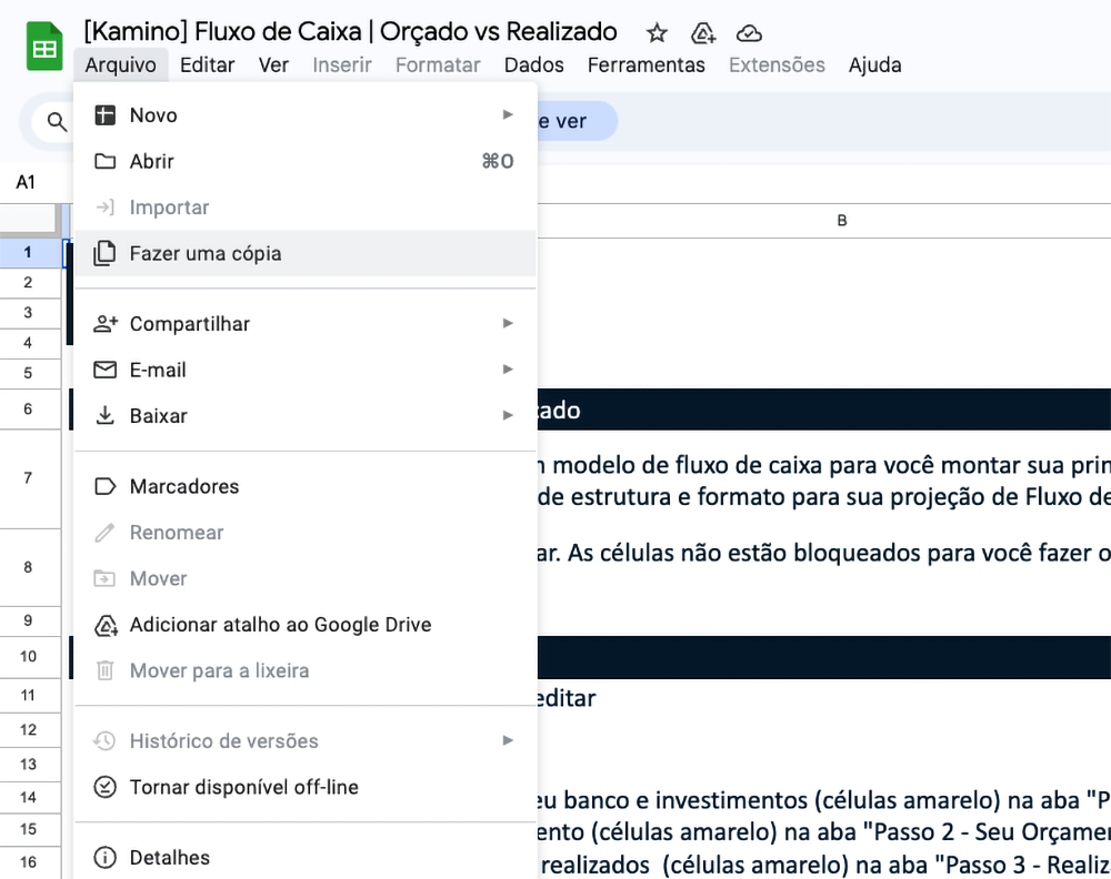 - Clique em “Arquivo” > “Fazer uma cópia” para copiar a planilha para a sua área de trabalho do Google Drive.